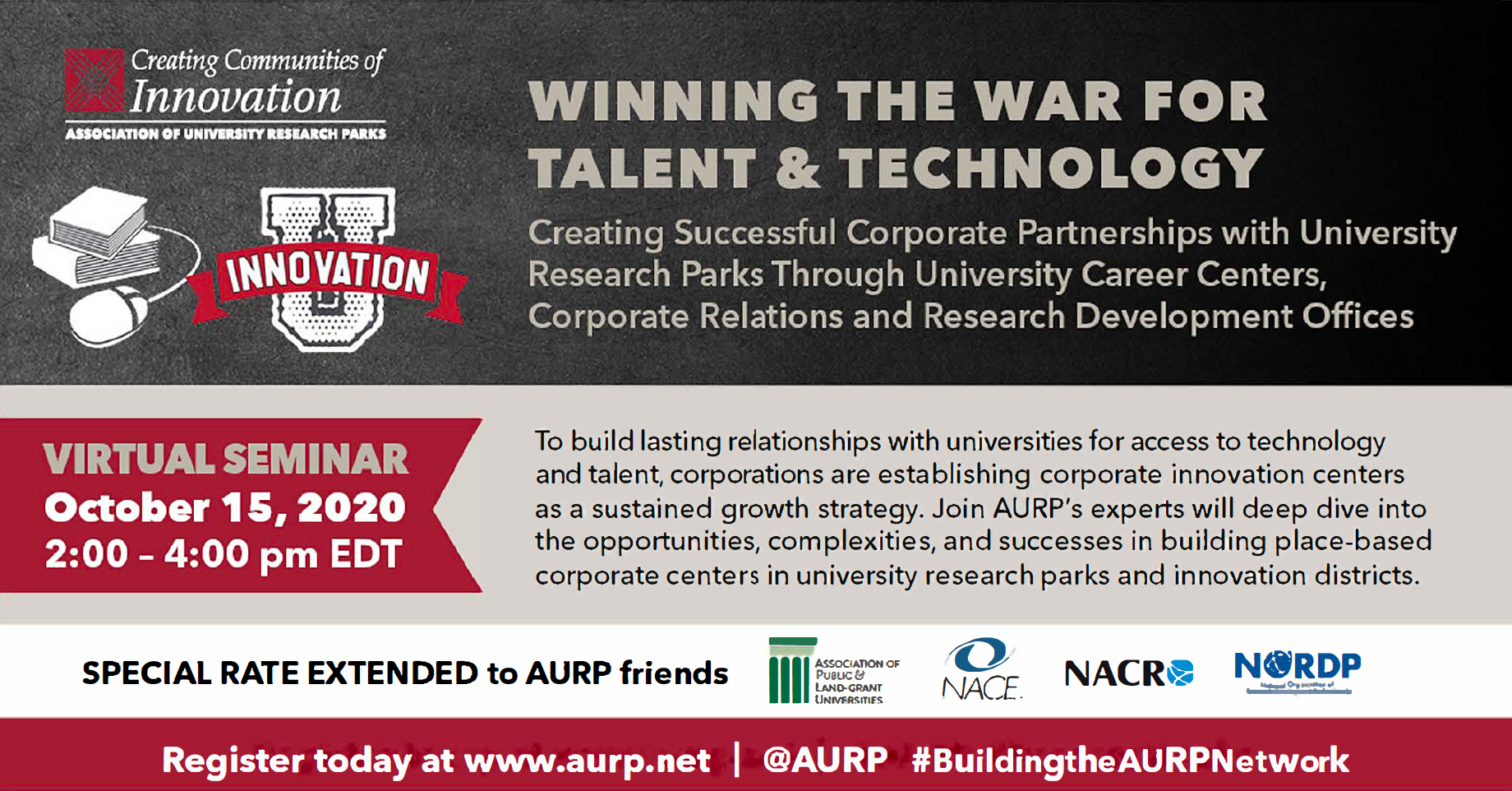 The webinar featured discussion of new bio program funding, new regulatory schemes, and new community engagement as solutions. Executives from bio and pharma manufacturing companies located in university research parks provided expert advice. The role of training for bio technicians was emphasized as part of the solution. And AURP presented its Excalibur Award for COVID-19 Response and Resiliency to the National Institute for Innovation in Manufacturing Biopharmaceuticals (NIIMBL) at the University of Delaware Research Park for being established before COVID-19 arrived on our shores.