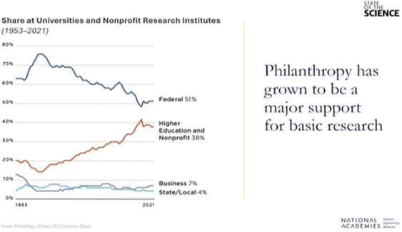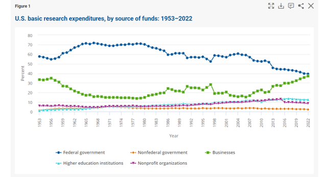 Surprisingly, while corporations now dominate in funding U.S.-based R&D, the percentage of university-based basic research funded by the private sector has declined since the 1950s – from over 10% in 1953 down to 7% in 2021.